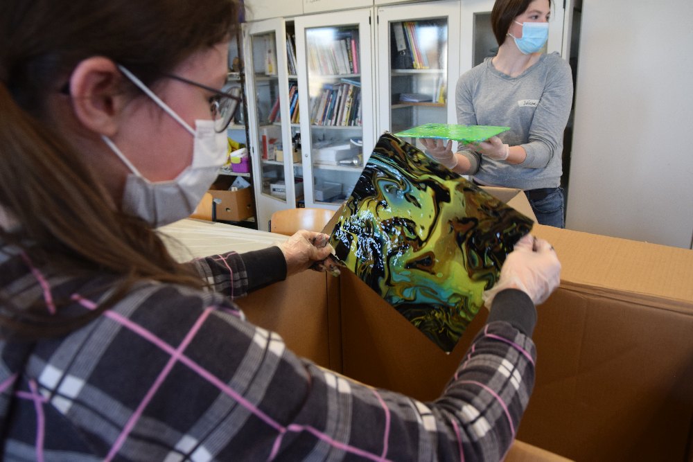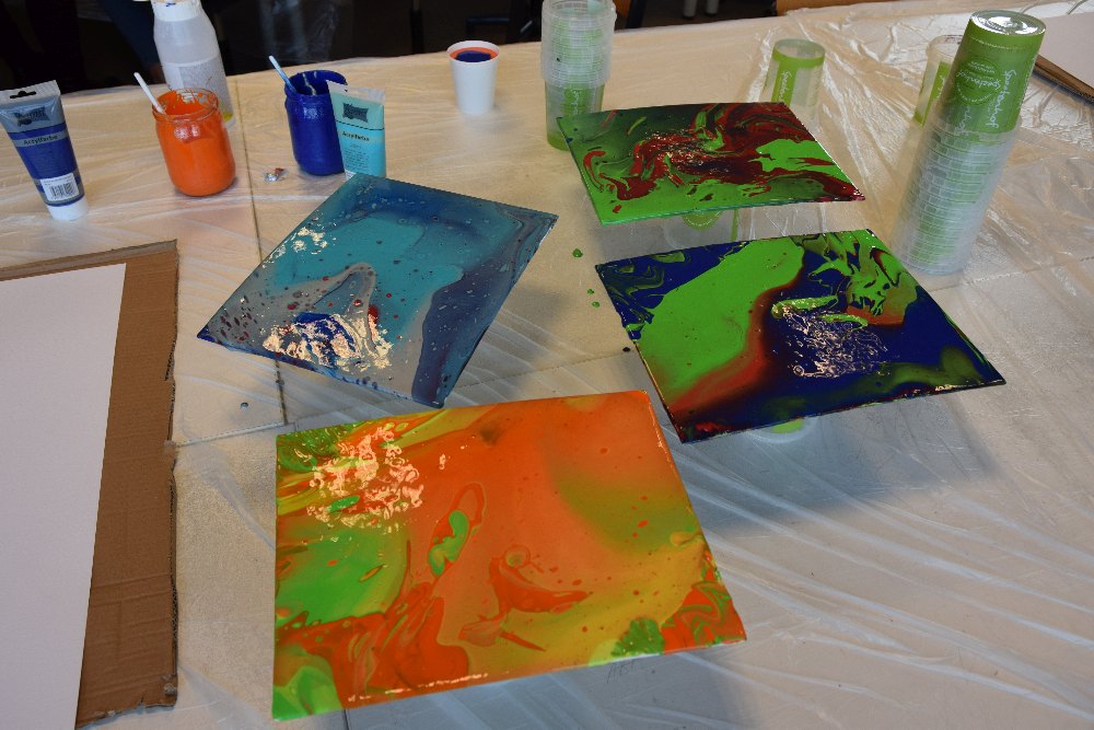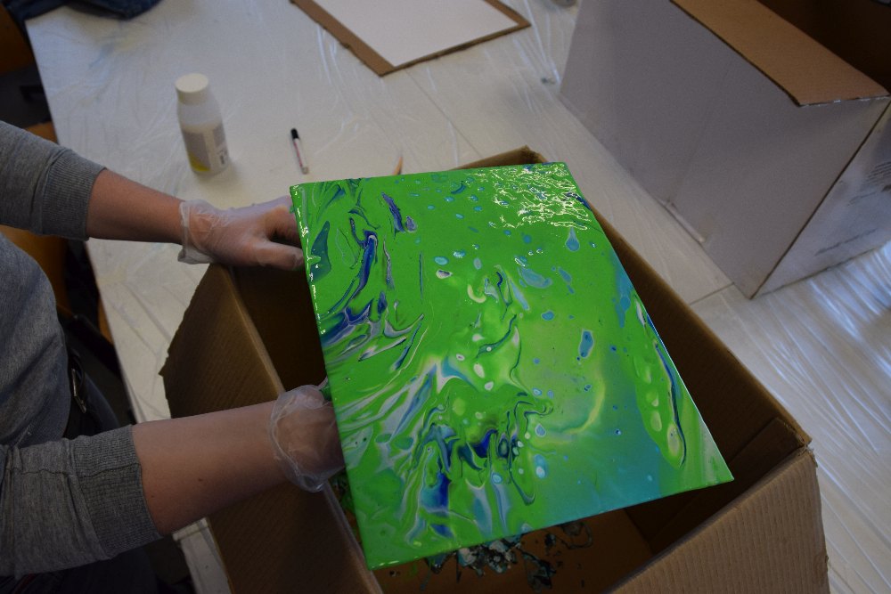 „Pouring“ bedeutet gießen, d.h. die Schüler*innen ließen Acrylfarbe über die Leinwand fließen und beeinflussten durch Drehen des Bildträgers das Resultat. Dieser Gestaltungsprozess versetzte nicht nur die Akteure selbst, sondern auch die Zuschauer ins Staunen, da sie vorher das Ergebnis nicht abschätzen konnten.