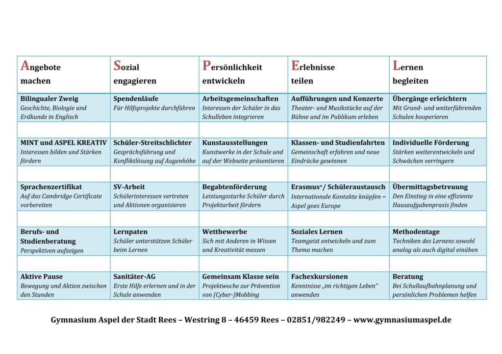 Im Anschluss daran laden wir Sie und Ihr Kind ein, das Gymnasium Aspel näher kennen zu lernen. Nehmen Sie gerne die Gelegenheit wahr, das Schulgebäude im Rahmen eines geführten Rundgangs zu besichtigen, oder erkunden Sie unsere Schule auf eigene Faust. Unter anderem können Sie an Unterrichtsstunden der Klassen 5 teilnehmen und Sie können sich in den Räumlichkeiten der Schule über Schwerpunkte unserer pädagogischen Arbeit und unser Bildungsangebot informieren. Hier werden Sie Gelegenheit haben, mit Lehrerinnen und Lehrern, Schülerinnen und Schülern unserer Schule ins Gespräch zu kommen und an abwechslungsreichen Aktivitäten teilzunehmen. Nutzen Sie und Ihr Kind die beiliegende Informationskarte, um bereits im Vorhinein einen Überblick über die Vielfalt unseres pädagogischen Programms zu erhalten.