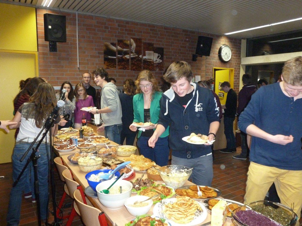 Das Highlight des Donnerstags war eindeutig unser „International Dinner“ in unserer niederländischen Gastschule, Udens College. Alle Schülerinnen und Schüler brachten Speisen und Getränke mit, die typisch für ihre Heimat sind (Kris aus Norwegen: „Norwegian cheese ist he BEST!“). Von den meisten landestypischen Spezialitäten hatten wir zwar noch nie etwas gehört, aber nachdem wir all unseren Mut aufgebracht hatten, auch die fremd aussehenden Dinge zu verköstigen, wurde es ein richtig schöner, gemütlicher Abend mit all unseren wunderbaren Gastfamilien, freundlichen Lehrern und neuen Mitschülern.