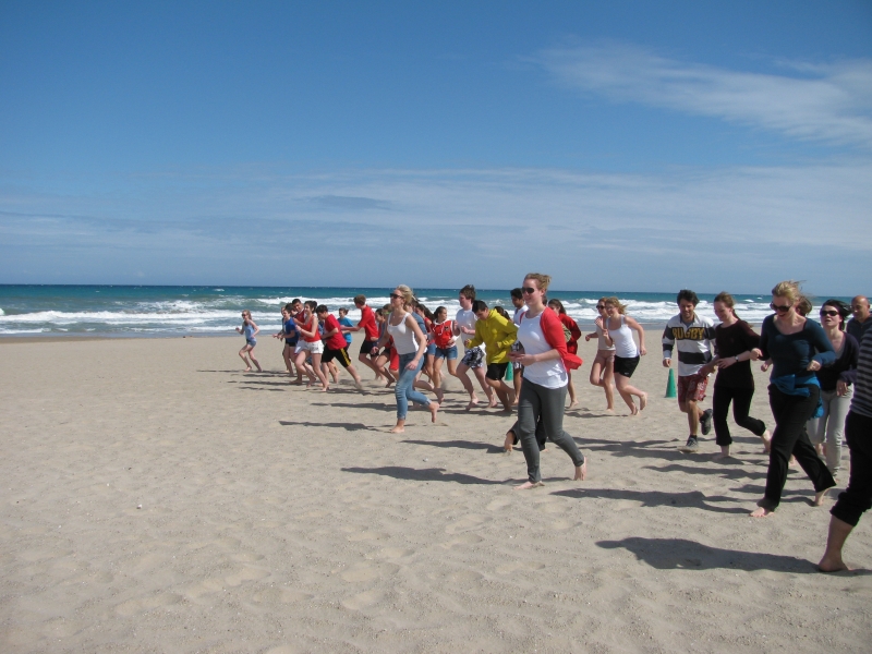 Mittags ging es dann endlich zum Strand. Das Wetter war sogar einigermaßen gut und nach einigen lustigen Aufwärmspielen im Sand, zum Beispiel „durch den Sand robben“, startete ein Beachvolleyball-Turnier.